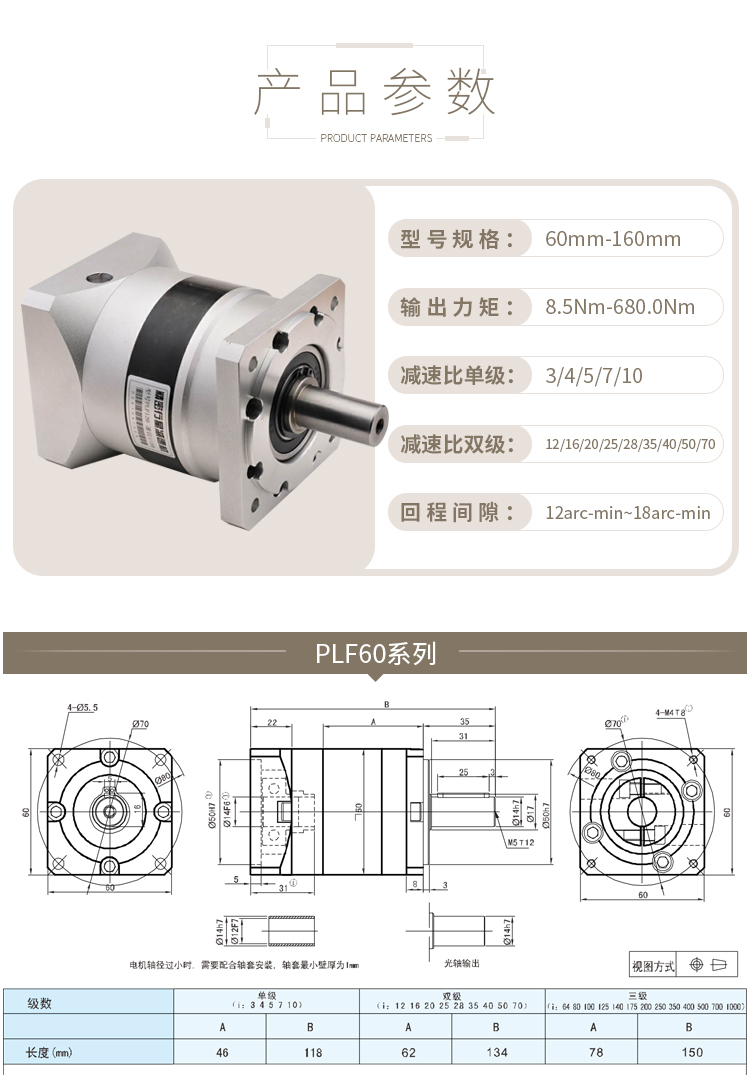 行星減速機特點:產(chǎn)品全面升級,采用前后油封,齒輪配件日本進口,國際知名品牌NSK軸承,具有高精度、高鋼性、高負載、高效率、高速比、高壽命、低慣性、低振動、低噪音、低溫升、外觀美、結(jié)構(gòu)輕小、安裝方便、精確定位等特點,適用于交流伺服馬達、直流伺服馬達、步進馬達、液壓馬達的增速與減速傳動。能與任何電機匹配安裝(如松下,安川,三菱,西門子,富士,臺達,東元,臺安,匯川,信捷,埃斯頓......)電機不同,與之匹配的尺寸將有所變化,適配器將不同,配特殊電機可以訂做??!